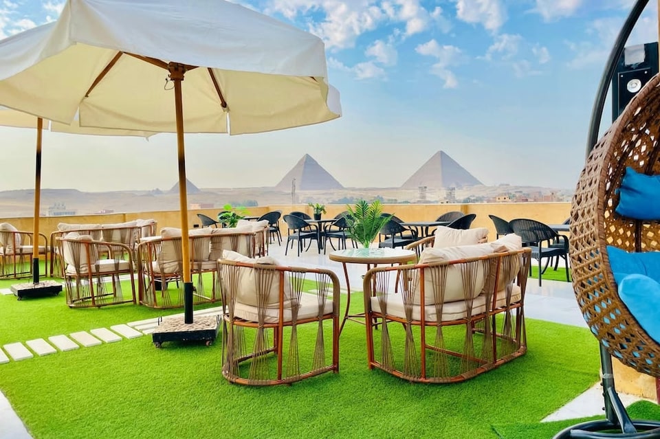 Palm Pyramids View Hotel features a shared lounge, terrace, a restaurant and bar in Cairo. The property is located 1.8 km from Great Sphinx, 2.9 km from Giza Pyramids and 16 km from Cairo Tower.