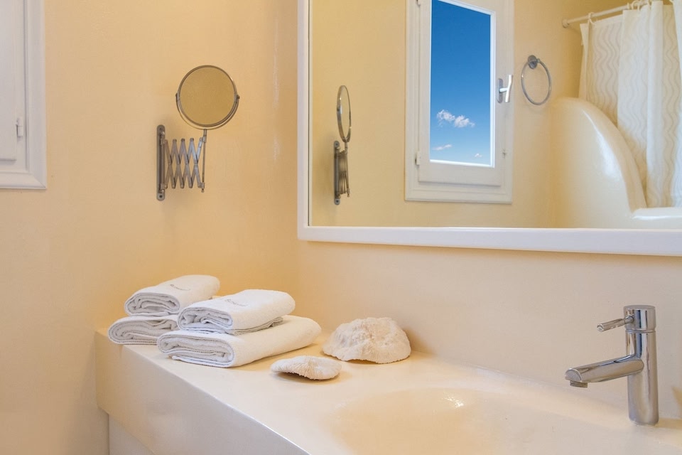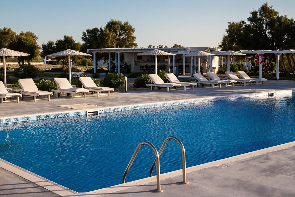 Az Égei-stílusú Sea Sound White Katikies szálláshelye Perivolos és Vlychada strandjai között, a tengerparton található, egy 33 hektáros privát területen.