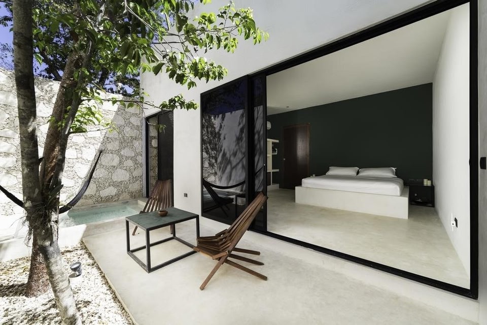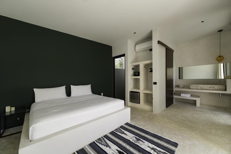 16Tulum is an architect-designed villa offering accommodations in Tulum, perfectly located between Tulum downtown and the beach zone. There are 5 bedrooms downstairs, 4 of which have private pools and gardens. The upstairs bedrooms have a large terrace. The property also offers a communal dining room, sunset lounge, tropical gardens featuring a spectacular 59 foot swimming pool and Jacuzzi, and a fire pit. Daily cleaning and concierge services are provided. The beach is 3.1 mi away and the city center ADO bus station 0.6 mi. Featuring free Wi-Fi and a year-round outdoor pool.